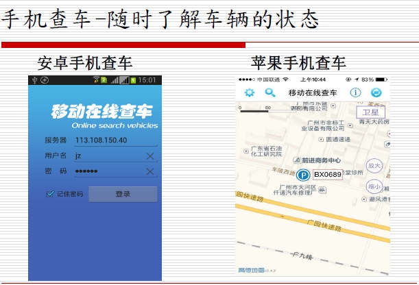 基于手機(jī)上網(wǎng)的便捷性,手機(jī)查車軟件深受客戶喜愛,只要您的手機(jī)開通上網(wǎng)功能即可隨時(shí)、隨地的上網(wǎng)查車,實(shí)時(shí)掌握車輛的動(dòng)態(tài)。目前磯準(zhǔn)手機(jī)APP查車軟件分兩種:蘋果手機(jī)系列、安卓版系統(tǒng)系列。