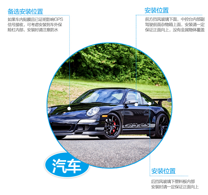 線最佳放置于車前窗靠近窗口的位置,天線要水平向上放置,同時建議加膠帶固定天線,不要只靠天線本身的磁性吸附在鐵上,因為時間一長,其本身磁性會衰退。要注意,除GSM天線外的其他部分須安置于車內(nèi)隱蔽位置,避免被隨意破壞。